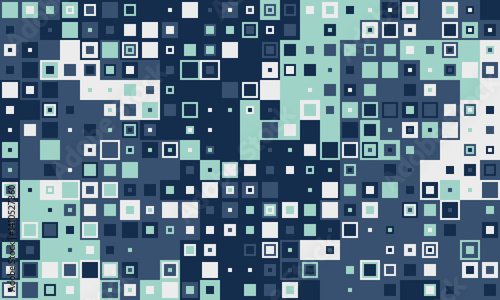 Abstract geometric pattern of varied sized squares in teal, navy, and white. Ideal for backgrounds, website design, or modern tech concepts.