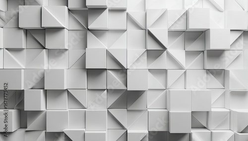 Abstract geometric pattern of white squares and triangles. A seamless texture of 3D shapes