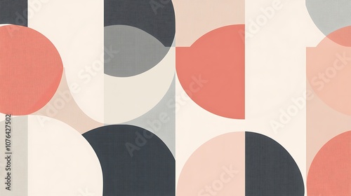 Abstract geometric pattern with overlapping circles and semi-circles in shades of pink, coral, grey and white.