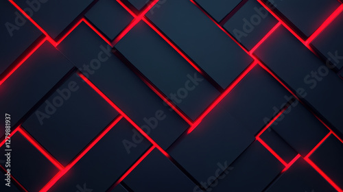 Abstract geometric pattern with overlapping dark shapes and red neon lines creating modern and dynamic visual effect. Perfect for backgrounds or digital designs