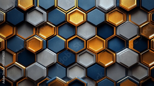 Abstract geometric pattern with silver, gold, and blue hexagons, creating a 3D effect.