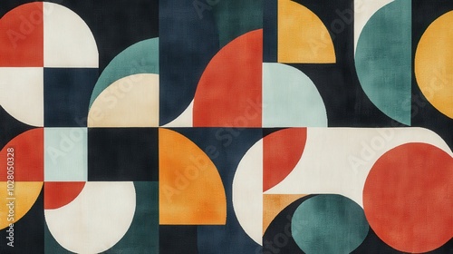 Abstract geometric pattern with vibrant semicircles and rectangles.