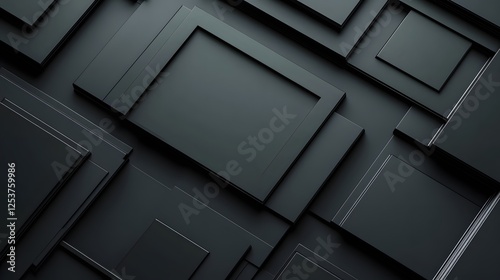 Abstract geometric shapes and patterns in a sleek monochrome minimalist digital Layered 3D cubes squares rectangles and triangles create a striking