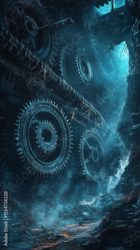 Abstract glowing blue machinery with pipes and gears in a dark setting.
