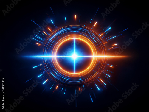 Abstract glowing circular design with vibrant blue and orange light bursts, creating a futuristic, high-energy visual. The central cross-shaped element adds a sense of focus and power.