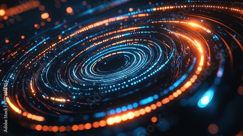 Abstract glowing circular pattern with blue and orange lights on a black background.