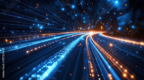 Abstract glowing digital pathways, blue and orange. Illustrates high-speed data transfer, technological advancement.