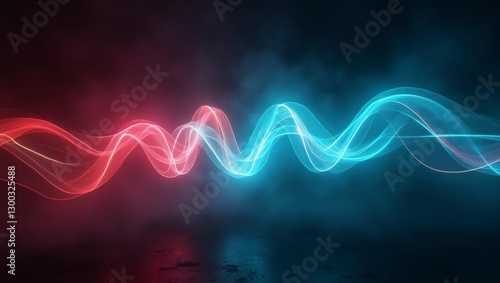 Abstract glowing energy wave flows across the dark, smoky stage with vibrant red and blue lights.