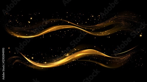 Abstract glowing golden light effect set illustration of swirling lines with sparkling stars on a black background