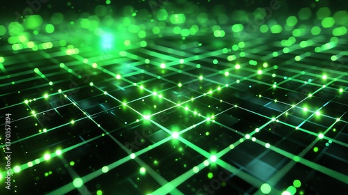 Abstract glowing green background of a grid with bright spots at the intersections.