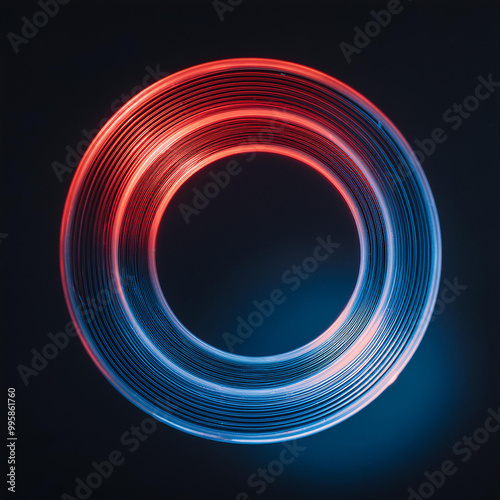 Abstract glowing neon round shape, red and blue colors, floating on dark background. Fantasy design