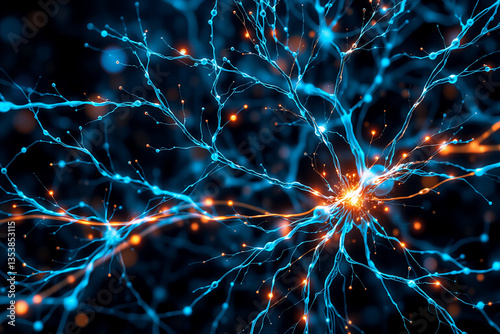Abstract glowing network of blue and orange lines branching like neurons. Interconnected, dynamic and vibrant energy flow visual representation.