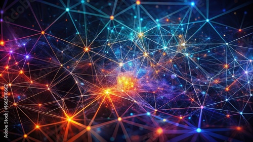 Abstract glowing network of interconnected nodes and lines with vibrant colorful lights isolated on transparent background