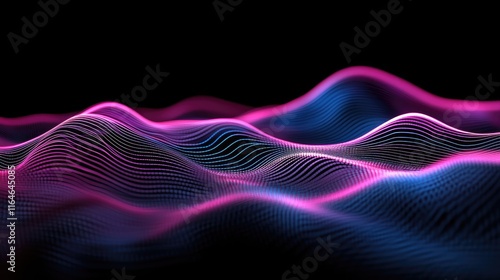 Abstract glowing pink and blue wave particles background.