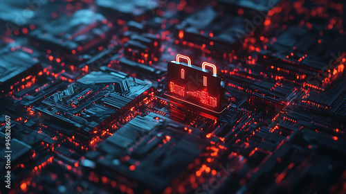 Abstract glowing red padlock on a circuit board.