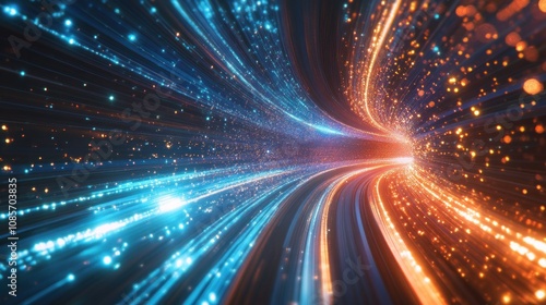 Abstract glowing tunnel of blue and orange light streaks with particles.
