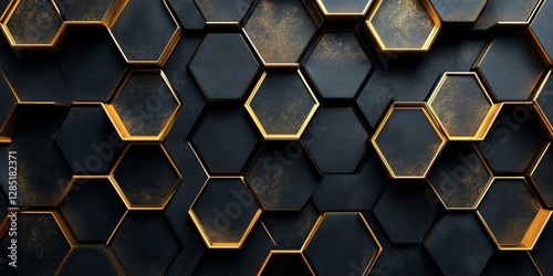 Abstract gold hexagons arranged in a 3D design on a black background, creating a futuristic look, Generative AI