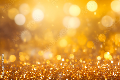Abstract golden bokeh and glitter background. Blurred lights effect. Holiday celebration and festive concept. Image for wallpaper, poster, banner, greeting card.