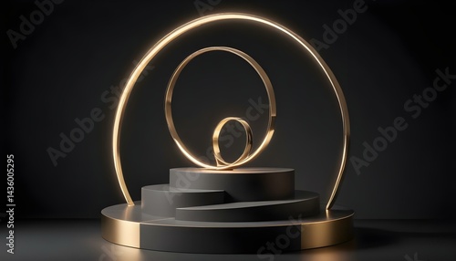 Abstract golden circles and a layered platform create a minimalist design against a dark backdrop.