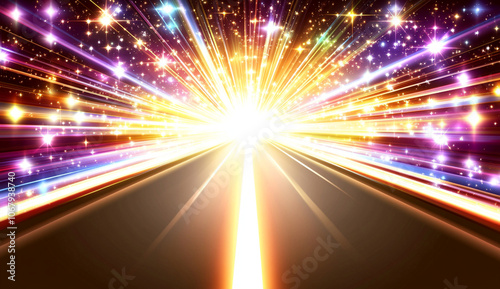 abstract golden light effect radiates with speed lines and sparkling stars, creating dynamic and energetic atmosphere. This captivating visual evokes sense of wonder and excitement