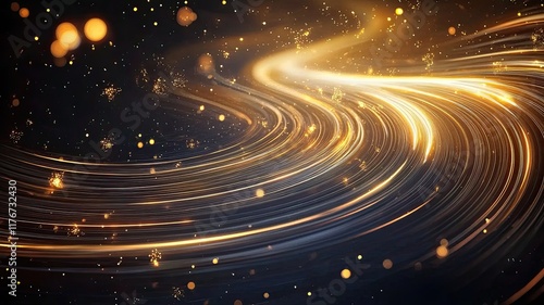 Abstract Golden Light Trails with Bokeh, A stunning abstract composition of golden light trails flowing in curved motion, surrounded by glowing bokeh particles, evoking energy and elegance.
