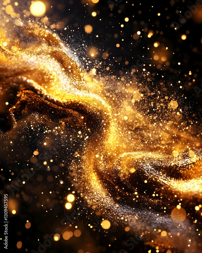 Abstract golden particles swirling in dark space.