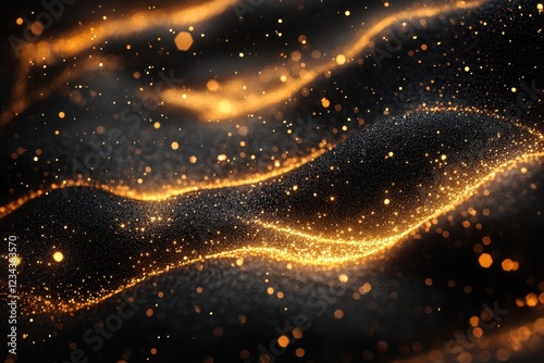 Abstract golden waves of light and particles on a dark background.