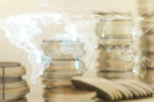 Abstract graphic digital world map hologram with connections on coins background, globalization concept. Multiexposure