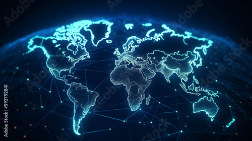Abstract graphic world map illustration on blue background, big data and networking concept Generative AI