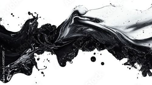 Abstract grayscale liquid splash, dynamic curves and swirls, isolated on white background