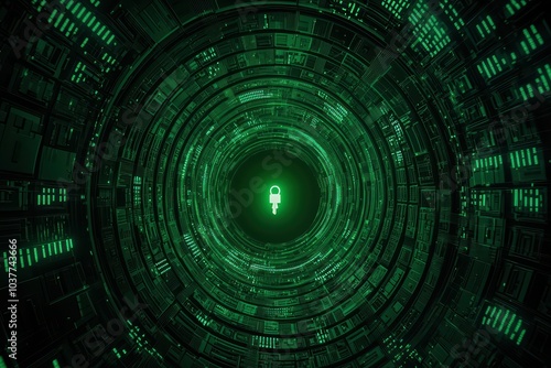 Abstract green digital tunnel with glowing lock symbol representing cybersecurity and technology concepts.