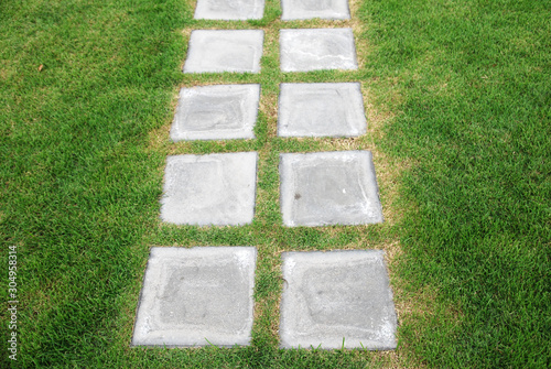Abstract green grass field and brick floor of footpath texture background