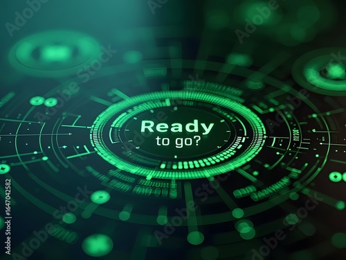Abstract green technological background features a futuristic circular interface, horizontal composition. The central design element displays the words Ready to go in a bright, eye-catching font.