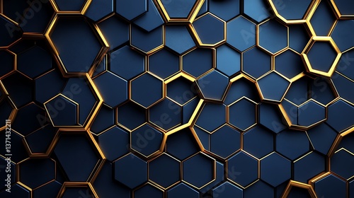 Abstract Hexagon Pattern: Dark Blue and Gold Geometric Background for Modern Designs and Creative Projects, 3D Rendering.