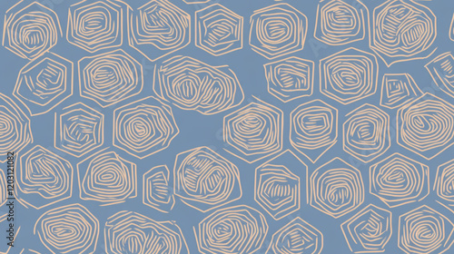 Abstract hexagonal shapes in seamless pattern on blue background, featuring white, hand drawn, symmetrical and uniform lines creating modern and artistic design