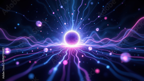 Abstract high-tech background featuring vibrant particles with purple and blue hues.
