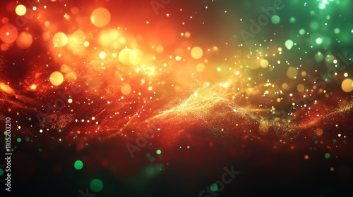 Abstract holiday illumination, defocused circular lights, deep crimson background fade, emerald and amber orbs, ethereal bokeh effect, elegant festive composition, blurred light spots, high-end