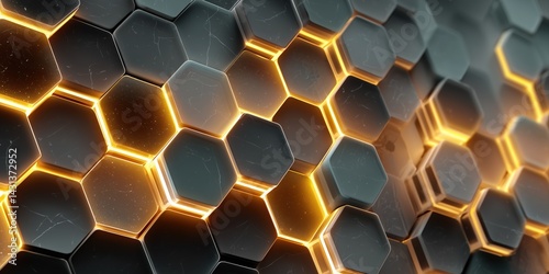 Abstract honeycomb pattern, glowing golden accents, dark geometric design with hexagonal tiles