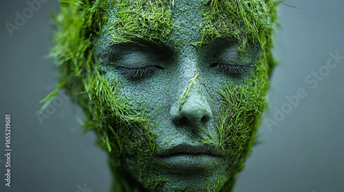 Abstract human figures covered in grass textures, blending nature and body forms, artistic concept highlighting environmental connection, creativity, and organic design.