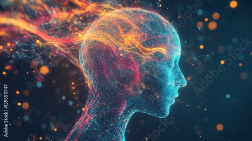 Abstract human head profile with colorful energy flowing from it on dark background.