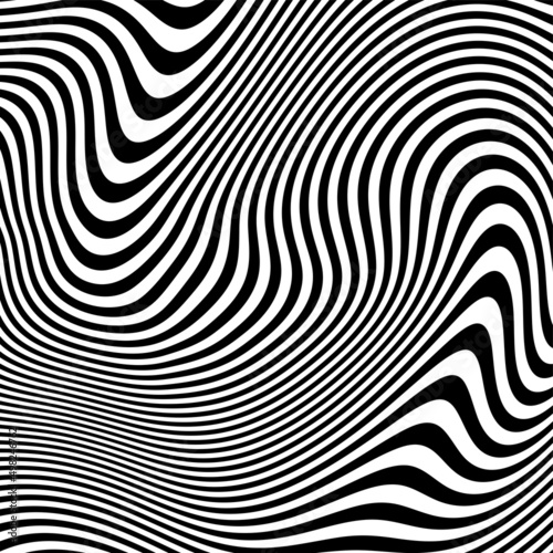 Abstract hypnotic pattern with black-white striped lines. Psychedelic background. Op art, optical illusion. Modern design, graphic texture.