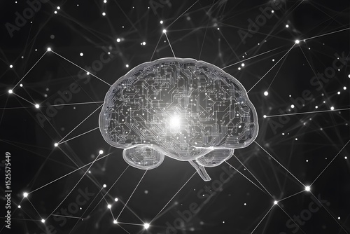 Abstract illustration of a human brain with glowing circuits and connections, symbolizing artificial intelligence, technology, and the future of cognitive science in a digital landscape