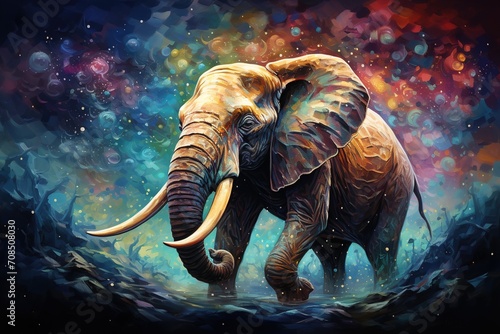 abstract illustration of an elephant walking on a psychedelic, brush stroked blue and purple background