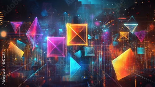 abstract illustration of geometric shapes and structures in colorful neon colors and lights in cyberspace against dark background