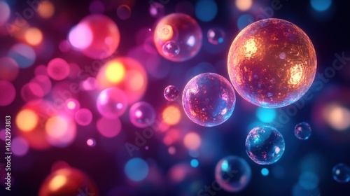 Abstract illustration of glowing spheres with varying sizes and colors, creating a vibrant, bokeh-filled background.