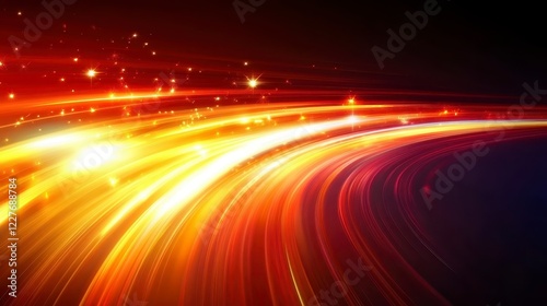 Abstract image of a curving highway at night, with streaks of vibrant orange and yellow light trails against a dark background. The light creates a