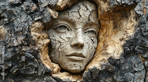 Abstract image of a woman's face carved from wood with bark texture. Background for design, book covers, art exhibition advertising.