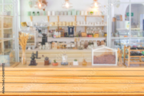 Abstract image of Empty wooden table with blurred front view of cafe restaurant or coffee shop in the hotel.
