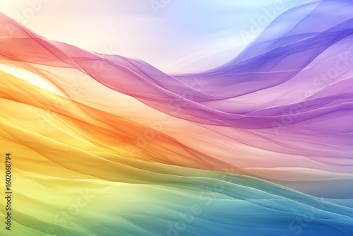 Abstract image of flowing, translucent fabric in a rainbow of pastel colors, creating undulating waves and a dreamy, ethereal atmosphere