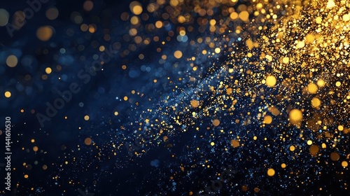 Abstract image of glowing golden particles dispersed over a dark blue background creating a sparkling and dynamic atmosphere